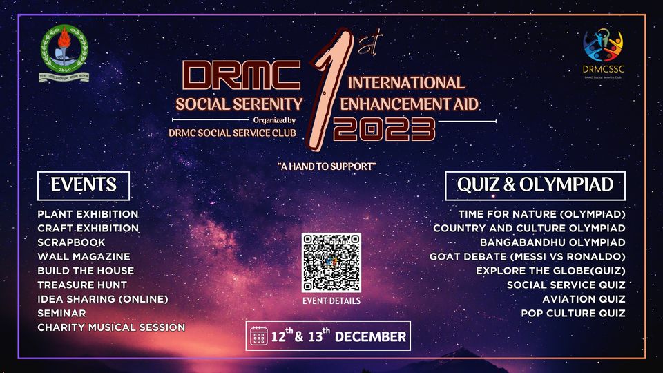 DRMC Social Service club brings you the 1st DRMC INTERNATIONAL Social Serenity Enhancement Aid 2023 .This time we are looking forward to amaze our participants with interesting events. Our main intention behind this event is to help the ones who are in need of common human rights such as food, clothes, education.